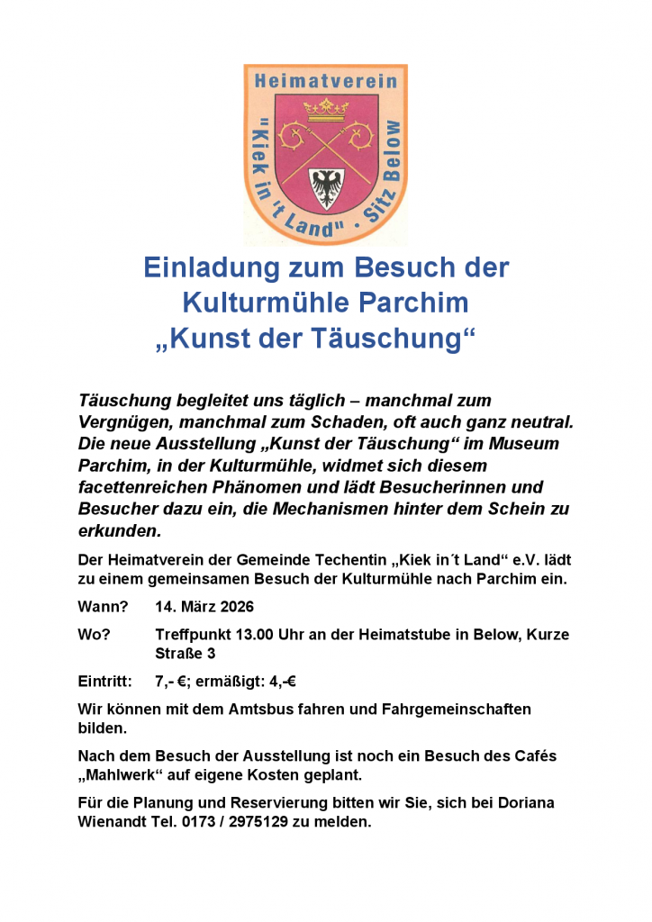 Der Heimatverein der Gemeinde Techentin „Kiek in’t Land“ e.V. lädt zu einem gemeinsamen Besuch der Kulturmühle nach Parchim ein.